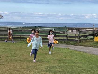 乗り物に乗り終わった子供たちから、芝生広場で鬼ごっこしたり、相撲をしたりとのびのびと遊んでいます。楽しそうです。