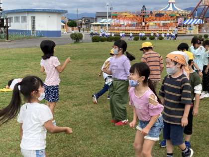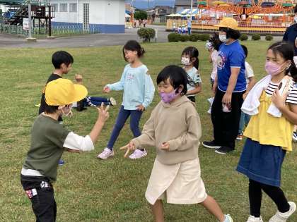 10月15日(金) 1・2年生 校外学習 ジャンケンゲーム 公開日 2021/10/15 更新日 2021/10/15 1年生 ハンカチ落としの次は、ジャンケンゲームをしました。 夢中になってあっという間に時間が過ぎていきました。