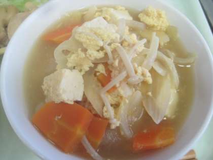 厚揚げ、人参、たまねぎ、、、と色々な色の野菜が入っていて、卵でとじてあり、きれいだから、「錦とじ」というのでしょうか。