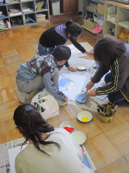 休み時間には、応援合戦で使う小道具づくりをしています。