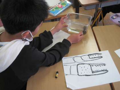 10月25日(月) 2年生 図画工作科 ザリガニ 公開日 2021/10/25 更新日 2021/10/25 2年生 担任の先生が捕まえてきたザリガニをデッサン中です。 「つぶつぶがある」 「胸のところがYになってる」、、、とよく観察して描いています。