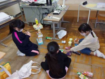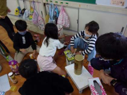 家から持参したお菓子の箱等を組み合わせて、楽しそうに遊んでいます。