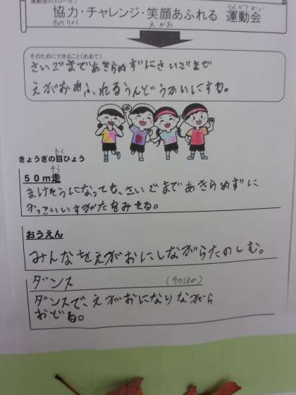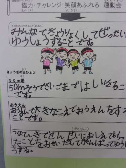 10月27日(水) 1年生 初めての運動会 公開日 2021/10/27 更新日 2021/10/27 1年生 1年生にとっては、小学校での初めての運動会です。昨年度、サンシャインチャレンジ陸上を経験しているとはいえ、応援合戦等がなかったので、2年生にとっても初めてといってよいでしょう。 運動会に込めた意気込み、思いを掲示しました。 最後まであきらめない、勝ちたい、笑顔、、、と素敵な言葉がたくさん書いてあります。