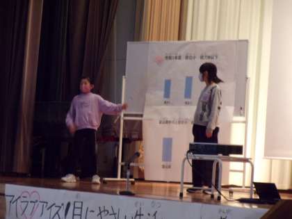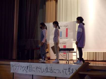 11月4日(木) 学校保健委員会 その1 公開日 2021/11/04 更新日 2021/11/04 朝日小学校NEWS 今年の学校保健委員会のテーマは、「目」です。 朝日っ子の視力が昨年に比べて低下していることから、今年度は「目」をテーマにしました。 昨年度の歯、姿勢は、終わったわけではなく、もちろん継続して取り組みつつも「目」にも焦点を当てました。 まずは、「つよく委員会」の発表から。データ等の紹介を劇を交えながら行いました。