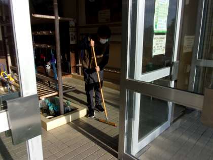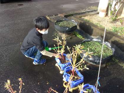 玄関では、今日も奉仕活動を続けている5年生、玄関前には、クラスみんなのホウセンカに水をやり続けている3年生がいました。みんなのためにこつこつと続ける姿に頭が下がります。