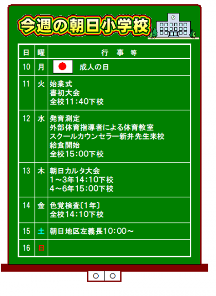 今週は、書初大会、外部体育指導者による体育教室、朝日カルタ大会等、早速行事が盛りだくさんです。書初大会や朝日カルタ大会は、練習の成果を発揮して頑張ってくださいね。
