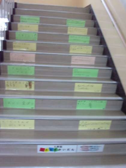 3月27日(日) 3年生 ことわざ階段アート大作戦 公開日 2022/03/27 更新日 2022/03/27 3年生 紹介しそびれていたので、今更ですが紹介します。 3年生は、一人一ことわざを書き、階段のステップに掲示してくれました。 階段を上るごとに、覚えることができますね。 英単語は1階から2階への階段に移動しました。 次年度も続けます!