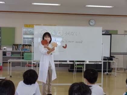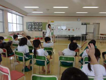 子供たちは、便を見れば、自分の健康状態が分かることや、冷たいものや油の多いものを食べ過ぎると、柔らかい便や堅い便になることを聞きました。