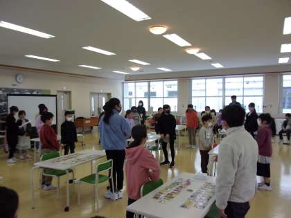 各学年の代表が集まり、全校児童は心の中で応援する朝日カルタ大会。