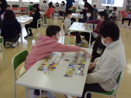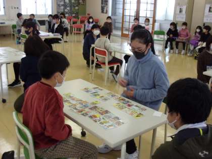 1月13日(木) 朝日カルタ大会 本選 その2 公開日 2022/01/13 更新日 2022/01/13 学校行事 一回戦から、5・6年生と対戦することになった低学年の子供も、果敢にチャレンジしている姿が頼もしいです。 5・6年生も低学年には負けられないと、死守しようと頑張る姿が素敵です。 残念ながら、高学年に負けて涙する子供もいました。美しい涙です。