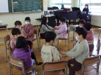 1月17日(月) 1年生 音楽科 ともだちとあそびながらうたおう 公開日 2022/01/17 更新日 2022/01/17 朝日小学校NEWS 円になって、ペアで「おちゃらかほい」を楽しそうにしています。 「おちゃらか 勝ったよ おちゃらか ほい!」と手を挙げたり、頭を下げたり、、、。