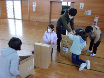 各家庭から持ち寄った段ボールで、段ボールハウスを作っています。