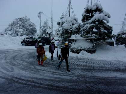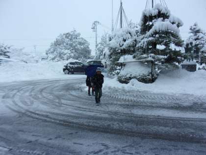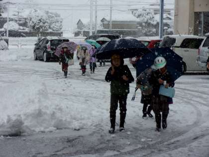 子供たちは、雪道を慎重に歩きながら、元気に登校してきました。
