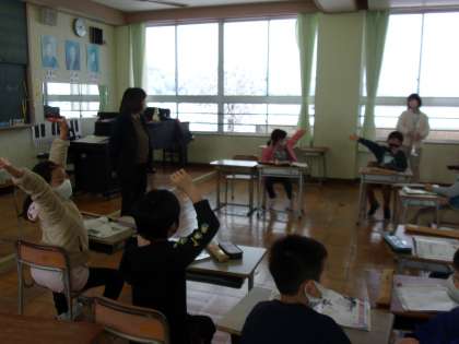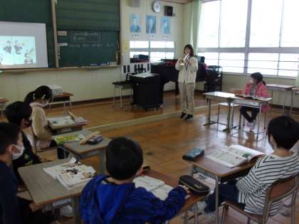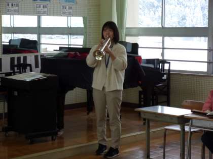 1月18日(火) 3年生 音楽科 トランペット吹きの休日 公開日 2022/01/18 更新日 2022/01/18 3年生 養護教諭は、吹奏楽部に所属していてトランペットを担当していたということで、今日は、音楽科の授業にお招きし、実際にトランペットを吹いてもらいました。 子供たちは、本物のトランペットの演奏に魅了されていました。 自分も吹いてみたい、吹けるようになりたいとさらに興味関心を高めていました。 本物は素敵ですね。