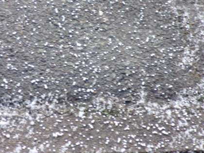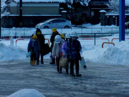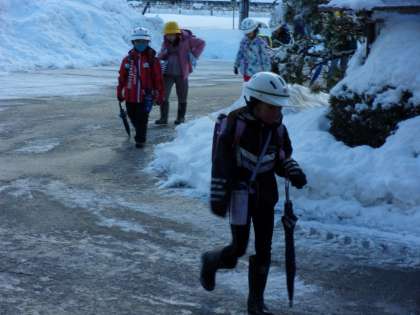 子供たちは、お腹に力を入れて、足下に注意して登校してきました。すぐに、「白い粒」に気付いていました。