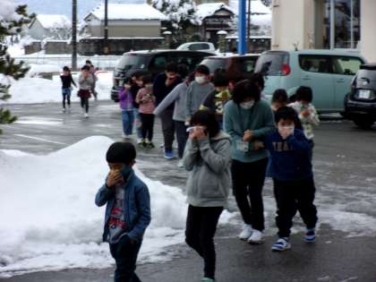 本来であれば、グラウンドへ避難すべきところですが、グラウンドは雪に覆われて避難できません。非常階段も、凍結して危険です。