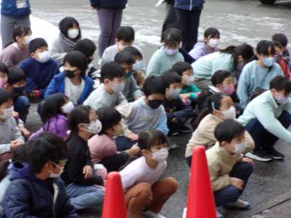 そこで、今日は、教室棟の階段、1階の非常口を通り、前庭へ避難する指示となりました。子供たちは、指示をしっかり聴き、静かに迅速に避難することができました。