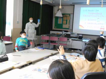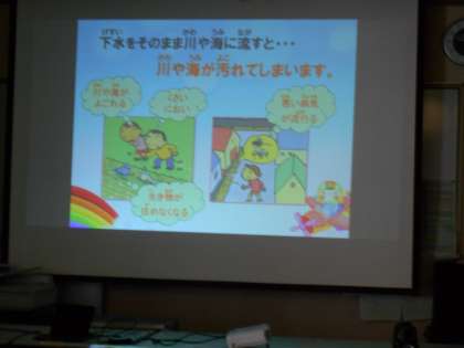 移動下水道教室で、浄化センターや汚れた水をきれいにする仕組みについて教えていただきました。