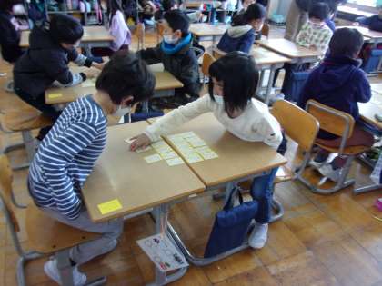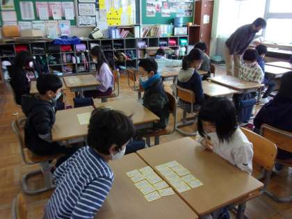 1月21日(金) 2年生 国語科 百人一首大会にエントリー 公開日 2022/01/21 更新日 2022/01/21 2年生 百人一首大会へエントリーした2年生は、学級で予選会を行っています。 接戦です。勝ち負けにこだわる負けず嫌いの子供たち。大事なことです。 気持ちが、前へ前へと行っているため、体がもう前のめりです。 校長先生が読み手をしてくださいました。 「校長先生、上手〜!」と大喜び。「校長先生にチャレンジしたい!」と校長先生に闘いを挑む子供も、、、。