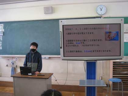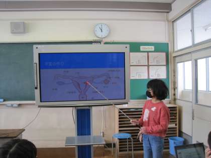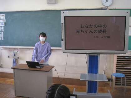 子供たちは赤ちゃんが母親の体の中でどのように育つのか、また母親の子宮はどのような働きをしているのかについて自分なりのテーマをもって調べてきたことをプレゼンテーションソフトを活用して発表をします。