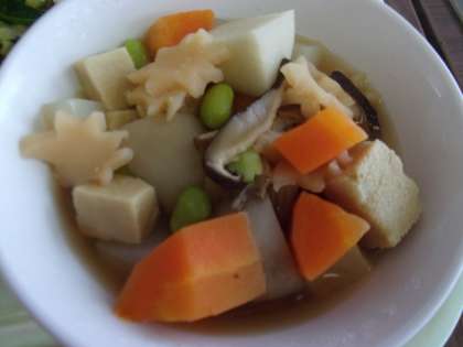 吹き寄せ煮には、紅葉の形のかまぼこが入っています。「吹き寄せ煮」とは、いろいろな具を取り合わせて入れ込む」という意味があるそうです。今日は里いも・干し椎茸・にんじん・たけのこ・こんにゃく・高野豆腐等、たくさんの具材が煮込んでありますね。かぜヒカレンジャーレッドがアドバイスしているとおり、バランスのよい食事で風邪を寄せ付けない体をつくりましょう。