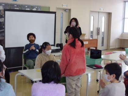 1月26日(水) 第1回百人一首大会 黄色札編 その5 公開日 2022/01/26 更新日 2022/01/26 学校行事 決勝戦は、なんと!3年生 VS 5年生の対戦となりました。 互角です。ランチルームの子供たちは固唾を呑んで見守っています。教室で観戦している子供たちは、クラスの友達が札をとると、「よし!」といってガッツポーズをしています。 接戦の末、5年生が優勝、3年生が次勝となりました。とても素晴らしい対戦でした。 オンラインで聴き合いも行いました。