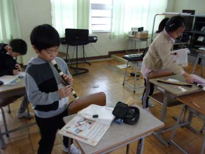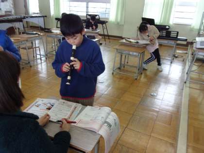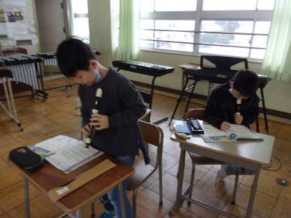 1月28日(金) 3年生 音楽科 リコーダー演奏 公開日 2022/01/28 更新日 2022/01/28 3年生 「パフ」をリコーダーで合奏します。 一人ずつ、先生チェックを受けています。先生にチェックを受けるまでは、自主練習をしています。