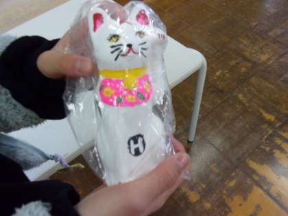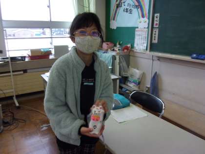 1月31日(月) 4年生 学びをつなぐ 公開日 2022/01/31 更新日 2022/01/31 4年生 国語科の授業で富山の伝統文化のひとつである「土人形」について調べた子供が、さっそく週末に土人形づくりを体験し、朝の会で紹介していました。 素晴らしい!自分で調べて学んだことを基に、体験し、発信している姿がとても素敵です。 かわいい招き猫の土人形です。教室にしばらく展示してくれることになっています。 興味のある人は、ぜひ見に行ってくださいね。