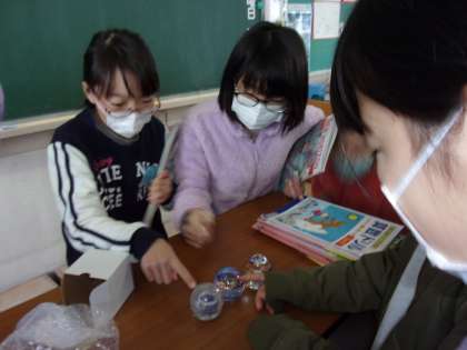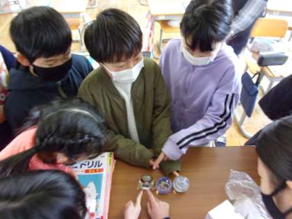 1月31日(月) 5年生 どれが誰のか分かるかな? 公開日 2022/01/31 更新日 2022/01/31 5年生 5年生が、6年生のペーパーウエイトをどれが誰のか当てています。 「あっ、この色使いは○○さんだな」 「これは、○○さんのだな」、、、とさすが、共に過ごしている子供たち! 完璧に当てていました。 個性が光るとても素敵な作品です。 昨年度の6年生の作品は、カレンダーになっているので見ながら、懐かしんでいました。