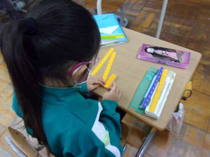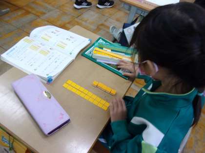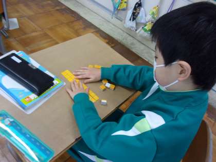 ブロックを使って、25+3について考えています。 10のまとまりを実感しています。