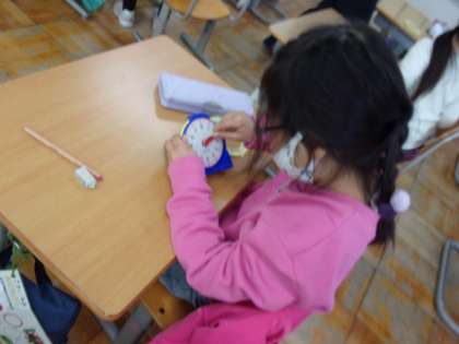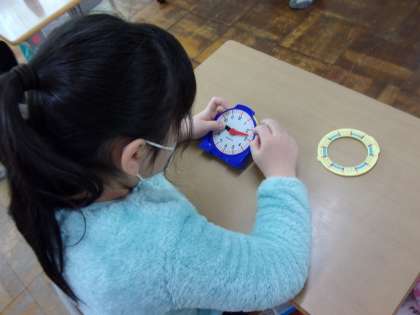算数ボックスに入っている時計を使って、○時○分を針を動かして示しています。