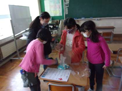 5・6年生は、ペットボトルキャップや古切手を集めて回っています。今日の分を確認しているところです。