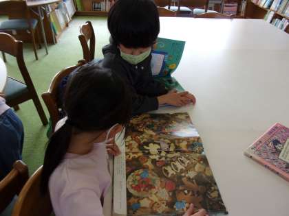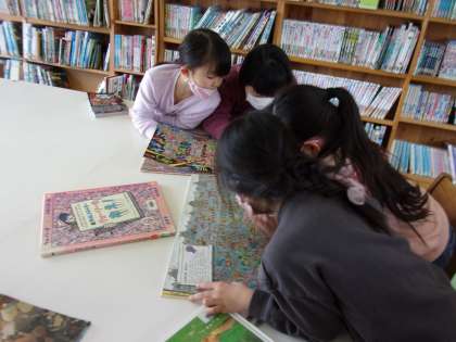 2月14日(月) 1年生 本大好き 公開日 2022/02/14 更新日 2022/02/14 1年生 図書室で司書の先生に本を読んでもらって大喜びの1年生です。 探しものシリーズも大好きで、集中してみんなで見付けています。