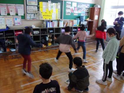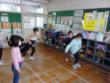 教室で反復横跳びの記録を測定しています。 何回跳べたかな。