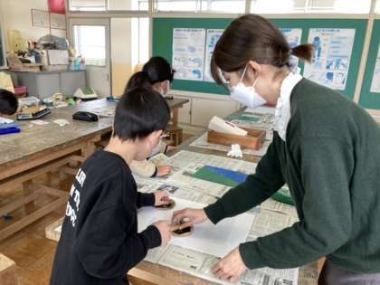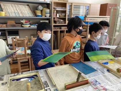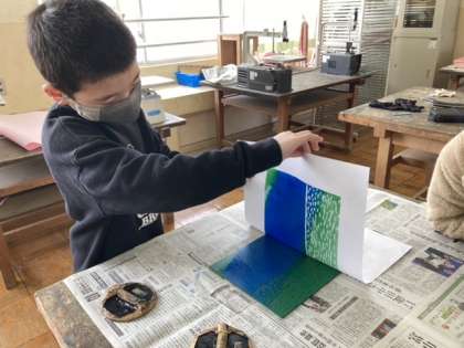 2月17日(木) 3年生 図画工作科 版画にチャレンジ その1 公開日 2022/02/17 更新日 2022/02/17 3年生 今日は、いよいよ版画の仕上げの日です。インクを付けて印刷しました。 できあがると、「すごい!」と歓声が上がっていました。