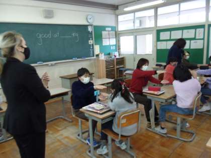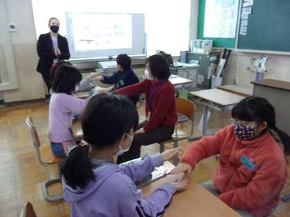 お互いの手をワニに見立てて、ALTが言う単語を繰り返しながら、ある単語のときだけ「パクッ」と手を挟むという活動です。