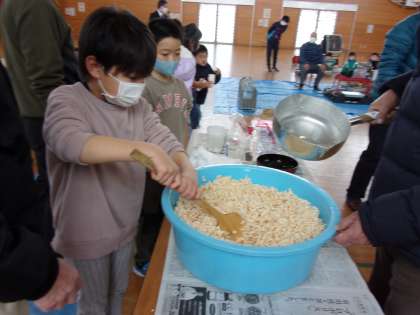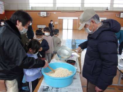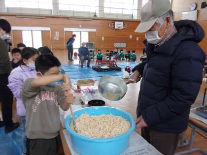 2月22日(火) ポン菓子づくり その3 公開日 2022/02/22 更新日 2022/02/22 朝日小学校NEWS 2年生が取り組んだ「ころもちづくり」で、残念ながら割れてしまったころもちもポン菓子にならないかと、地域の方々は昨日試作してくださいましたが、ころもちはポン菓子にはならなかったということでした。 これも、やってみたからこそ分かることですね。 2年生は、ポン菓子に煮詰めた砂糖をかけて混ぜ合わせる作業を体験させていただきました。
