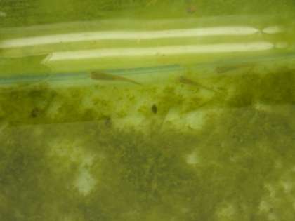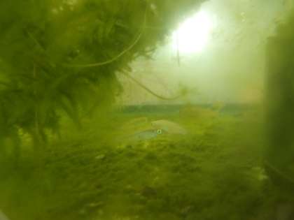 カメは冬眠中ですが、メダカは元気に泳いでいます。が、藻の周りでじっと立ち泳ぎ中です。メダカも寒いのかな。