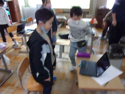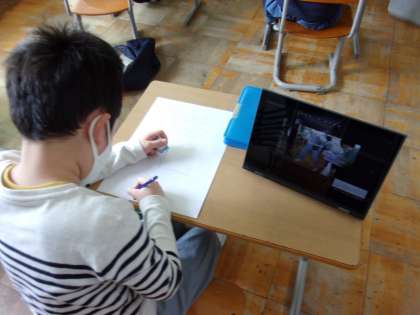 ポーズをつくり、chromebookのセルフタイマー機能で撮影し、それを見ながら描いている子供もいます。