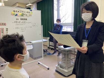 3月1日(火) オンライン授賞式 公開日 2022/03/01 更新日 2022/03/03 朝日小学校NEWS 小中書き初め大会、わたしのママ・パパを描こう、身近な自然の絵の3つの表彰式をオンラインで行いました。 誇らしげに校長先生から賞状をもらい、とても嬉しそうです。 チャレンジし続けると素敵なことの可能性も広がっていきますね。 各教室でも授賞式を行いました。 児童玄関前には、書初展入賞作品が掲示してあります。