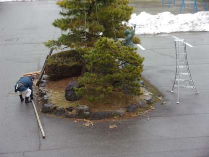 ついこの間、用務員さんが冬支度として前庭の木々の雪つりをしてくださっていた気がしますが、もう雪つりをほどく作業をしておられます。