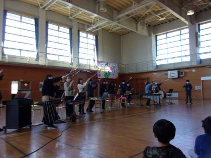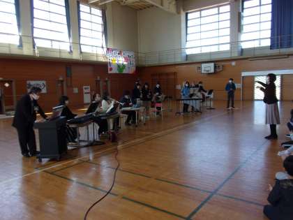 時間をつくって練習をし、3人で学校をひっぱってくれた6年生に「ありがとう」の気持ちを込めて演奏をしました。曲は、「ありがとう」です。
