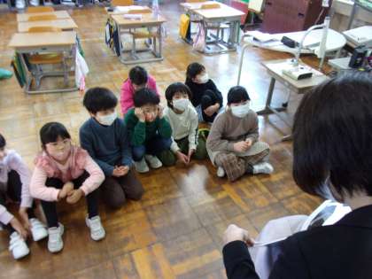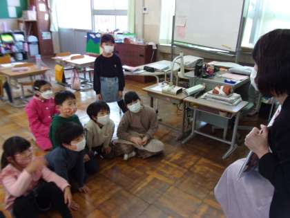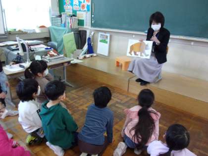 3月9日(水) 1年生 英語で読み聞かせ 公開日 2022/03/09 更新日 2022/03/09 1年生 今日のサンシャインチャレンジタイムは、スペシャル読み聞かせです。 校長先生が、英語で読み聞かせをしてくださいました。 子供たち同士の読み聞かせタイムで絵本の内容は知っているので、英語でも簡単! J先生との外国語活動で英語に慣れ親しんでいる子供たちは、英語の読み聞かせも興味津々! 校長先生の英語を繰り返しながら楽しく読み聞かせタイムを過ごしました。発音もバッチリ!