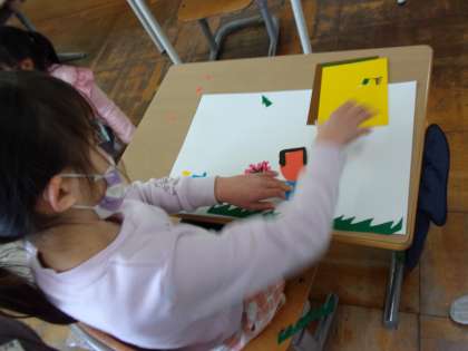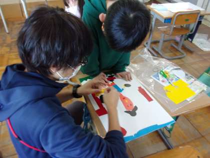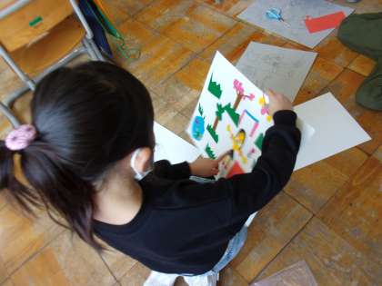 3月9日(水) 1年生 図画工作科 版画 その1 公開日 2022/03/09 更新日 2022/03/09 1年生 図画工作の学習も、それぞれの学年の学習が次の学年へとつながっているのがよく分かる版画の学習です。 1年生は、まだ「彫ること」はせずに、思い描く絵に基づきながら、画用紙を切って貼っていきます。