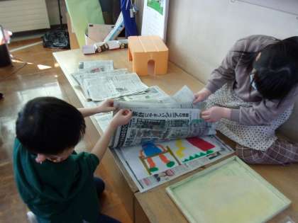 3月9日(水) 1年生 図画工作科 版画 その2 公開日 2022/03/09 更新日 2022/03/09 1年生 下絵ができたら、いよいよ版画に。 画用紙からちゃんと着色されるので、こするだけ。 完成間近です。