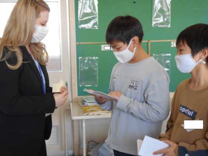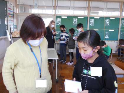 I wash my teeth.など、はきはきと1日を伝えることができると、ALTからステッカーがプレゼントされ、子供たちは張り切っていました。