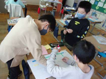 3月16日(水) 3年生 理科 マグネットマジック 公開日 2022/03/16 更新日 2022/03/16 3年生 図画工作科の授業のようですが、理科の授業です。 磁石の働きを使って、おもちゃを作っています。表面には、マグネットが付いた紙を貼り、裏から磁石で動かします。 迷路、クレーンゲーム、、、とアイディアいっぱいです。 試しに遊びながら、楽しみながら作っています。