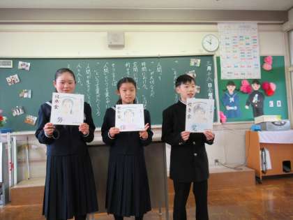 プレゼントされた色紙には、絵や習字が得意な先生たちが書いた似顔絵と、その子一人一人に送る漢字一字が書かれていました。そっくりな似顔絵、ぴったりな漢字です。
