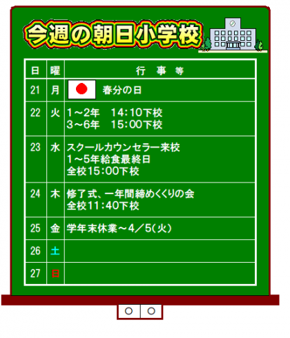 3月20日(日) 今週の朝日小学校