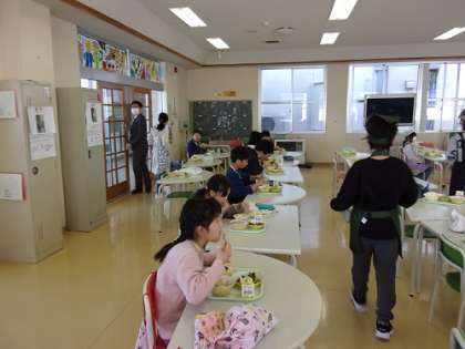 4月8日(金) 6年生 今年度の給食は… 公開日 2022/04/08 更新日 2022/04/08 6年生 今年度の給食が始まりました。昨年度と異なり、6年生は4・5年生とともにランチルームで食べることになりました。 互いに声をかけ、一人一人が食べる量に気を配りながら配膳を進めていました。さすが6年生。